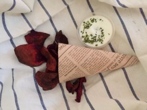 A megtisztított céklát vágó géppel vagy éles késsel hajszálvékonyra szeleteljük. Összeforgatjuk az ecettel, sóval és pici olívaolajjal. 180 fokos sütőben sütjük addig, hogy a szeletek elkezdjenek zsugorodni. Ekkor a hőfokot csökkentjük, kb. 150 fokra és ropogósra szárítjuk.
